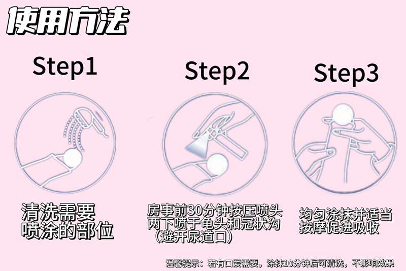 Approximately 30 minutes before intimacy, press the spray head twice to apply the product to the glans and coronal sulcus (avoiding the urethral opening).